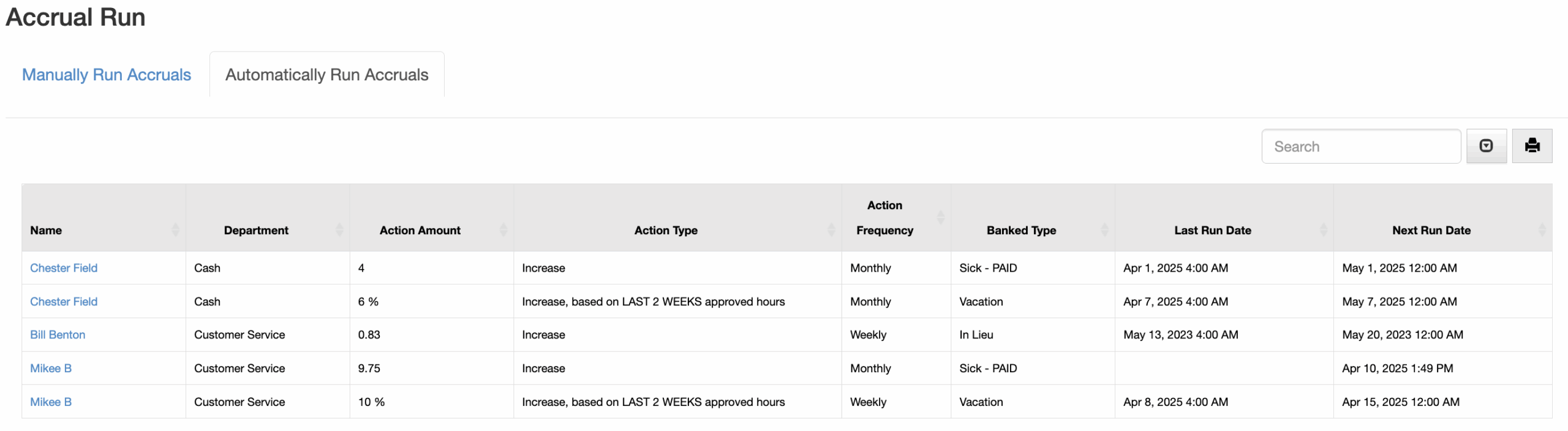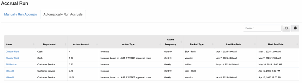 Accrual report shows amount, type & frequency