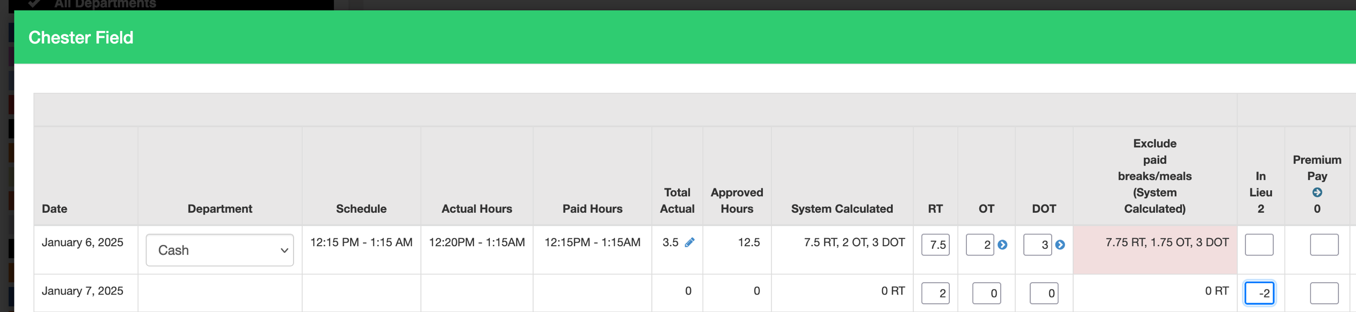 - You can move the hours from a banked hour column to RT/OT/DOT. In this example you can see 0hrs for January 7. We can move 2hrs from IN LIEU to January 7 RT hours so the employee receive pay.