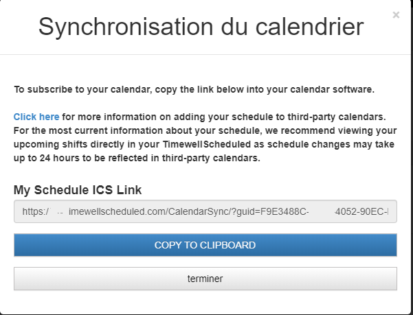 Cliquez sur le lien COPY TO CLIPBOARD pour copier votre lien unique dans votre presse-papiers pour le coller dans une application de calendrier tierce. Remarque : Ce lien vous est propre et vous ne devez le partager avec personne d’autre !