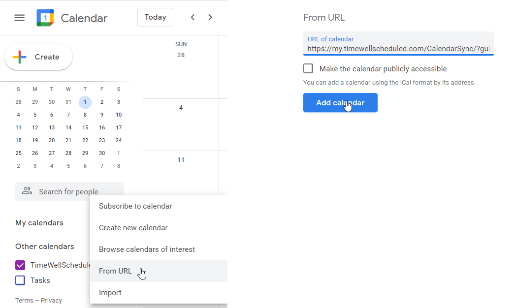 Collez votre lien unique dans le champ De l’URL, puis cliquez sur Ajouter un calendrier !